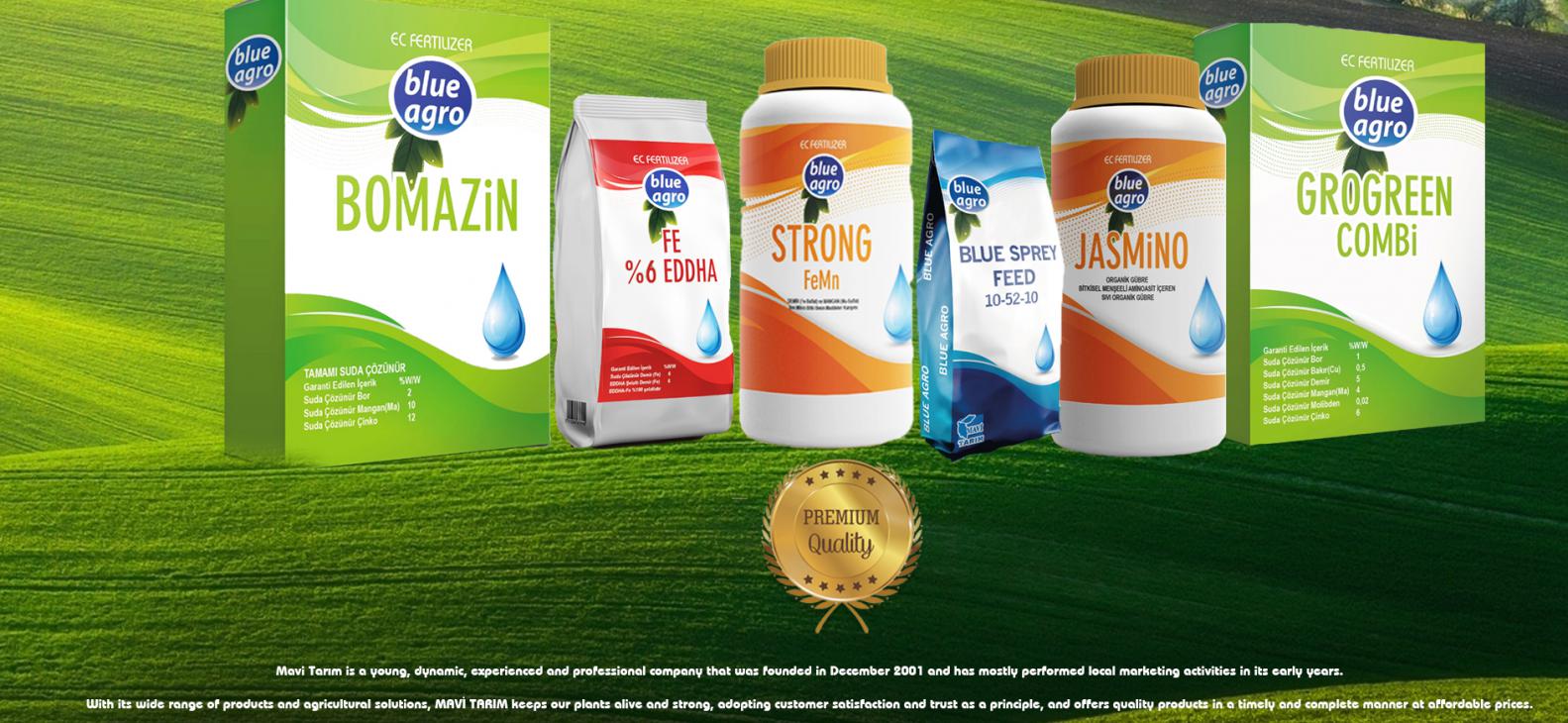 Yoğun çabalarımızla portföyünü hem de teknik ve idari personelini güçlendirerek lokal bölgeden çıkıp, bütün Türkiye'ye hitap edecek düzeye gelmiştir. Mavi Tarım Ltd. Şti. Tarımsal girdiler açısından daha çok spesifik(özel) ürünler ile ilgilenerek, bu tip ürünleri Türk çiftçisinin hizmetine sunmaktadır.