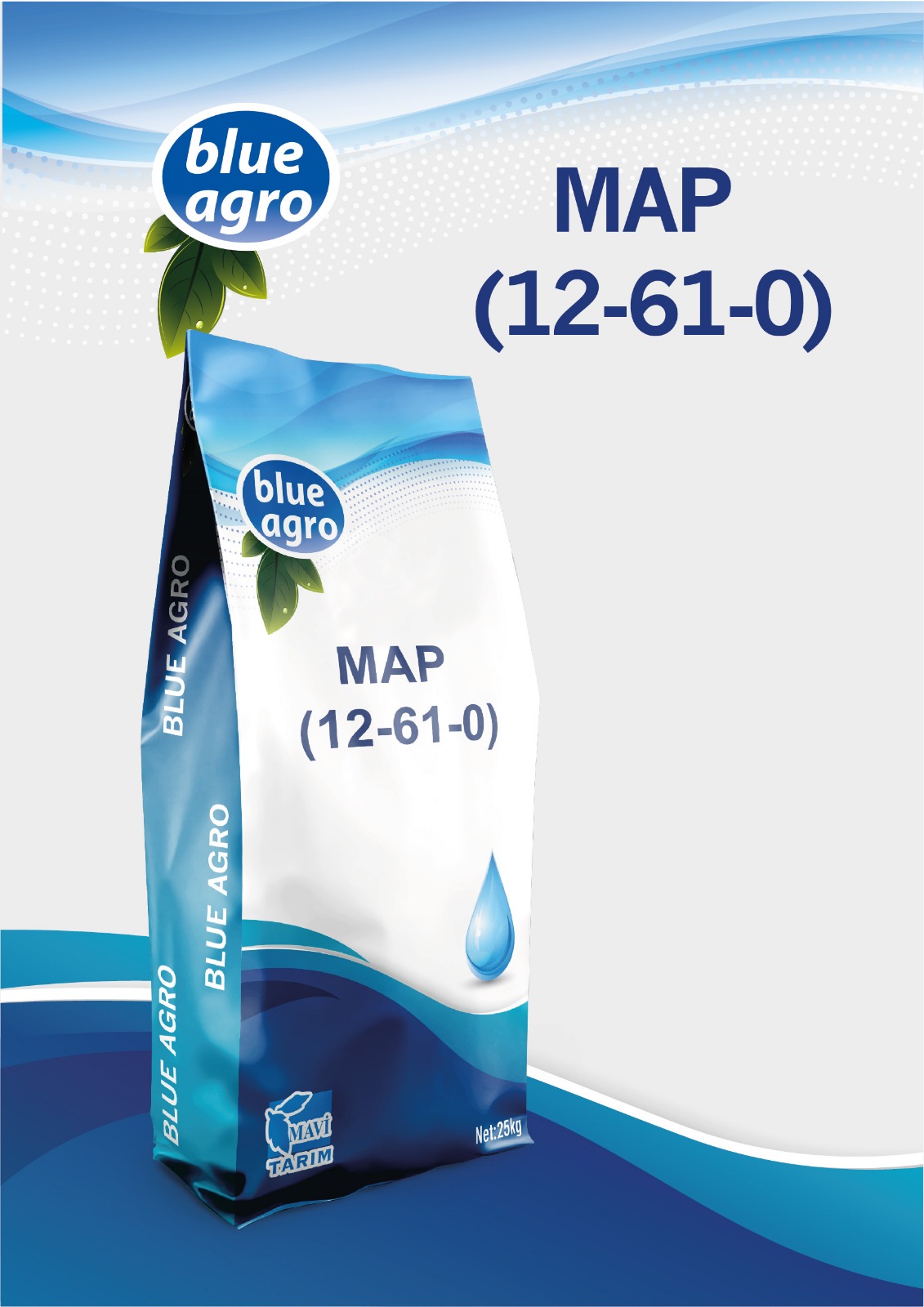 MAP (12-61-0) suda tamamen eriyen bir gübredir. Formülü NH4H2PO4 - %12 N (azot) + %61 P2O5 (fosfor) şeklindedir. Fosfat kaynağı gübreler arasında en yüksek oranda fosfat içeren gübre türüdür. İçeriğindeki düşük azot miktarı sayesinde, bitkilere istenen oranda fosfor sağlamanın en uygun yoludur. Klor, sodyum ve ağır metaller gibi, bitkilere zarar verebilecek herhangi bir madde içermediğinden, tüm ürünlerde güvenli bir şekilde kullanılabilir. MAP gübresindeki azotun tamamı amonyak azotu olduğundan, bu elementin bitkilere kontrollü olarak ulaşması sağlanır.